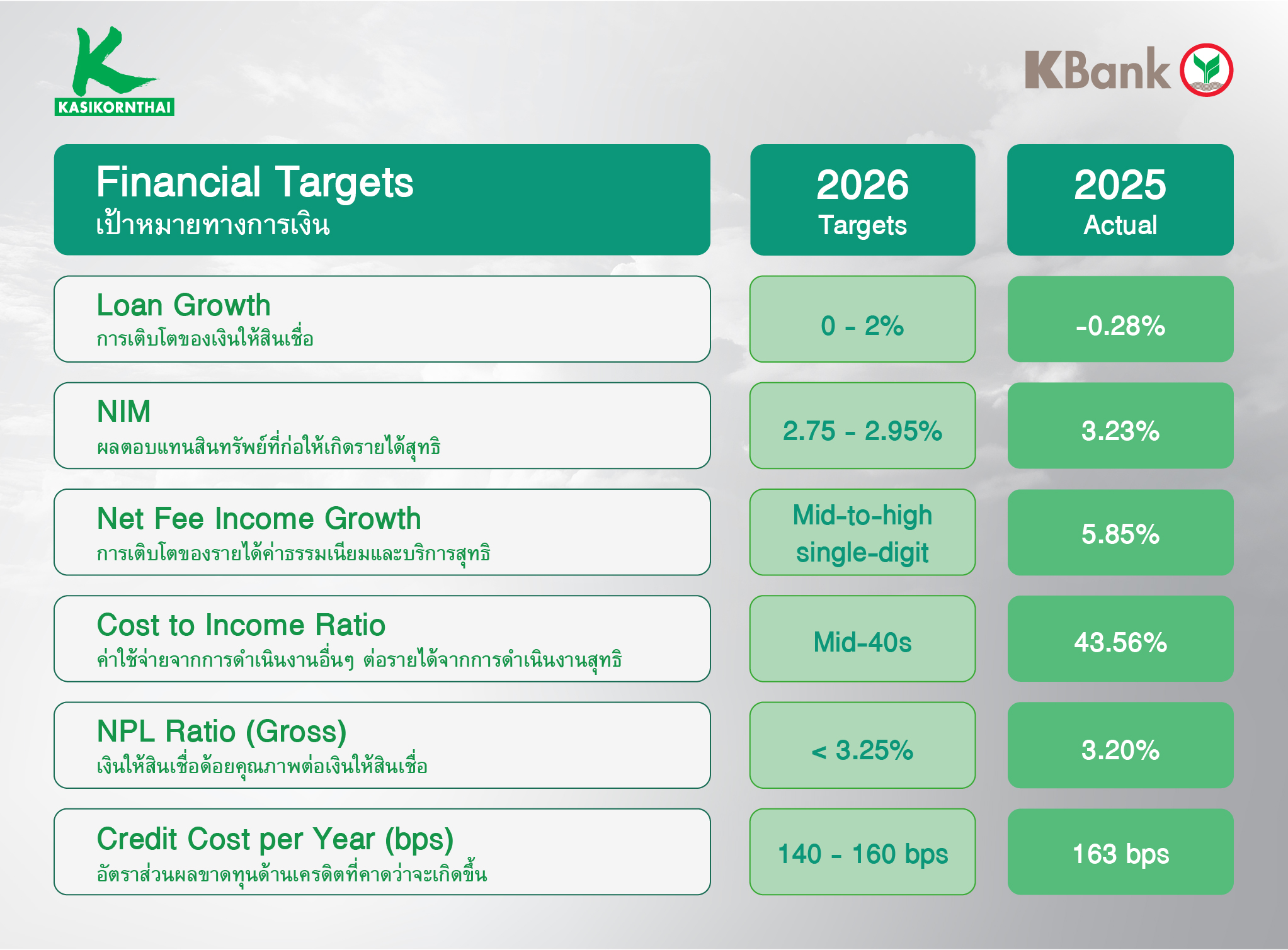 KASIKORNBANK (KBank) has announced its 2026 financial targets, aiming for balanced growth amid ongoing economic challenges. The Bank is moving forward to elevate the K-Strategy 3+1 and Productivity to the next level through a Customer Strategy, while fostering deeper and more sustainable relationships across all customer segments. The Bank is committed to delivering financial solutions that precisely meet the customers’ needs at the right moment, driving the Bank, customers and all stakeholders to grow together with balance and sustainability over the long term.