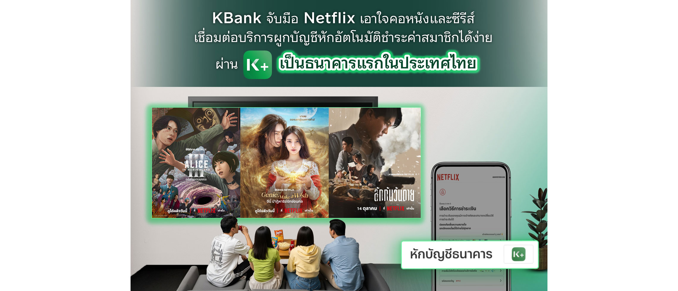 ธนาคารกสิกรไทย ตอกย้ำความเป็นผู้นำด้านบริการทางการเงินด้วยการจับมือกับ Netflix ผู้นำบริการสตรีมมิงด้านความบันเทิงระดับโลก เปิดให้บริการชำระค่าสมาชิก Netflix ผ่านการผูกบัญชีธนาคารแบบหักบัญชีอัตโนมัติผ่าน K PLUS เป็นธนาคารแรกของประเทศไทย ซึ่งพัฒนาโดยบริษัท กสิกร โกลบอล เพย์เมนต์ จำกัด (KGP) บริษัทในกลุ่มธุรกิจการเงินของธนาคารกสิกรไทย เพื่อมอบประสบการณ์การชำระเงินที่สะดวก ราบรื่น และปลอดภัยสูงสุดให้แก่ลูกค้า