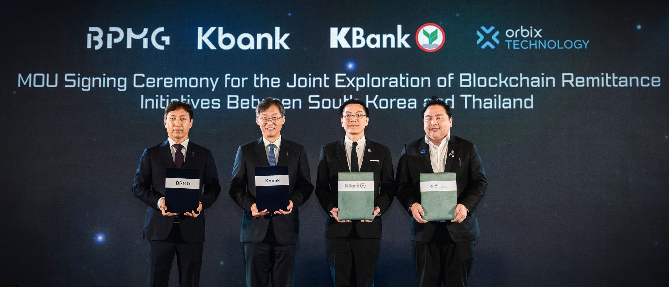 ดร.กรินทร์ บุญเลิศวณิชย์ (ที่ 2 จากขวา) รองผู้จัดการใหญ่ ธนาคารกสิกรไทย นายพิสิทธิ์ กุลกาญจนาชีวิน (ที่ 1 จากขวา) กรรมการผู้จัดการ บริษัท ออร์บิกซ์ เทคโนโลยี แอนด์ อินโนเวชั่น จำกัด Mr. Woo Hyoung Choi (ที่ 2 จากซ้าย) CEO ธนาคาร Kbank สาธารณรัฐเกาหลี และ Mr. Chang Kyun Oh (ที่ 1 จากซ้าย) Deputy CEO บริษัท BPMG ผู้ให้บริการด้านเทคโนโลยีบล็อกเชนชั้นนำของสาธารณรัฐเกาหลี ร่วมลงนามบันทึกข้อตกลงความร่วมมือ (MOU) เพื่อศึกษาแนวทางพัฒนาโซลูชันบริการทางการเงินข้ามพรมแดนด้วยเทคโนโลยีบล็อกเชนระหว่างประเทศไทยและสาธารณรัฐเกาหลี ซึ่งครอบคลุมถึงการศึกษาแนวทางการพัฒนาโซลูชันการโอนเงินด้วยนวัตกรรมบล็อกเชนสำหรับแรงงานไทยที่ทำงานอย่างถูกต้องตามกฎหมายในสาธารณรัฐเกาหลี โดยความร่วมมือนี้จะมีการหารือ และขออนุญาตจากหน่วยงานกำกับดูแลที่เกี่ยวข้องก่อนให้บริการจริงในอนาคต นับเป็นอีกก้าวสำคัญในการยกระดับระบบการโอนเงินและการชำระเงินข้ามพรมแดนให้มีความรวดเร็ว ปลอดภัย และมีประสิทธิภาพมากยิ่งขึ้น ซึ่งเป็นรากฐานสำคัญในการยกระดับโครงสร้างพื้นฐานทางการเงินของภูมิภาคสะท้อนวิสัยทัศน์ร่วมขององค์กรจากทั้งสองประเทศในการขับเคลื่อนเศรษฐกิจดิจิทัล (Digital Economy) โดยพิธีร่วมลงนาม MOU ดังกล่าวจัดขึ้น ณ โรงแรม ดิ แอทธินี โฮเทลแบงค็อก, อะ ลักซ์ชูรี คอลเล็คชั่น โฮเทล เมื่อเร็ว ๆ นี้