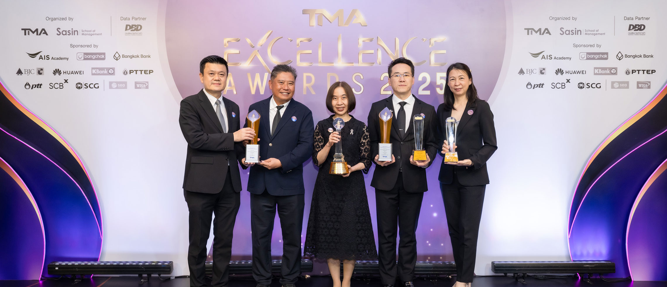 พร้อมด้วยนายชลัฐ ศิริพงศ์วุฒิกร (ที่ 2 จากขวา) รองผู้จัดการใหญ่ ธนาคารกสิกรไทย เป็นผู้แทนธนาคารร่วมรับมอบรางวัล SMEs Excellence Awards 2025 ได้แก่ รางวัลพระราชทานในสมเด็จพระกนิษฐาธิราชเจ้า กรมสมเด็จพระเทพรัตนราชสุดา ฯ สยามบรมราชกุมารี รางวัลประเภทธุรกิจบริการ ซึ่งธนาคารได้รับร่วมกับบริษัท วินด์ชิลล์ จำกัด ในงานประกาศผลรางวัล TMA Excellence Awards 2025 จัดโดยสมาคมการจัดการธุรกิจแห่งประเทศไทย (TMA) ร่วมกับสถาบันบัณฑิตบริหารธุรกิจศศินทร์ แห่งจุฬาลงกรณ์มหาวิทยาลัย ณ โรงแรมวอลดอร์ฟ แอสโทเรีย กรุงเทพฯ เมื่อเร็ว ๆ นี้