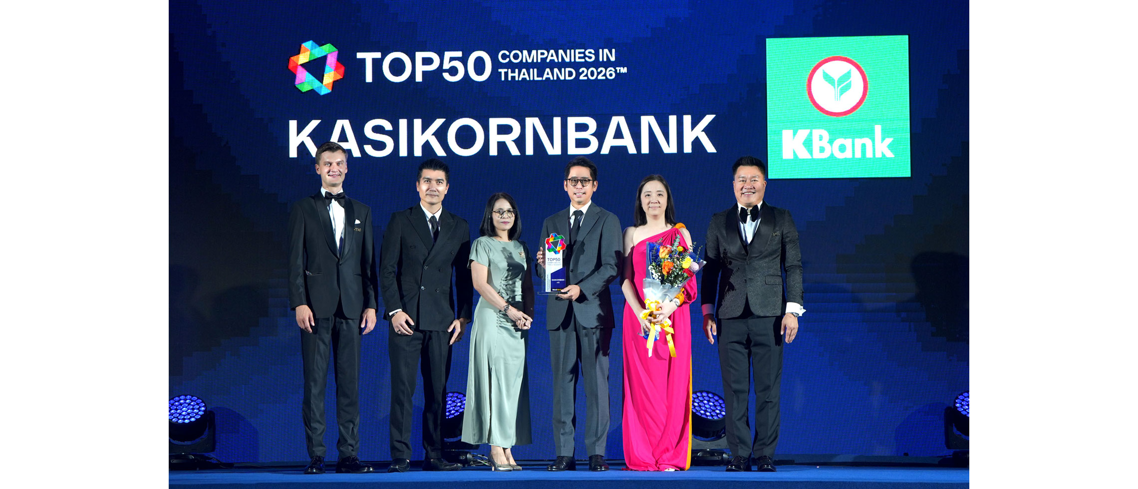 นายศาสตรา มังกรอัศวกุล (ที่ 3 จากขวา) รองผู้จัดการใหญ่ ธนาคารกสิกรไทย พร้อมด้วยผู้บริหารสายงานทรัพยากรบุคคล เป็นตัวแทนธนาคารรับมอบรางวัล 1 ใน 50 บริษัทชั้นนำที่น่าทำงานที่สุด ในงาน TOP50 Companies in Thailand 2026 จากผลสำรวจความคิดเห็นคนทำงานรุ่นใหม่กว่า 12,000 คน โดยธนาคารกสิกรไทยอยู่ในลำดับที่ 12 ของบริษัทที่น่าร่วมงานด้วยมากที่สุด และได้รับรางวัลมาอย่างต่อเนื่อง 8 ปีซ้อน สะท้อนมาตรฐานการบริหารคนและวัฒนธรรมองค์กรชั้นนำที่เติบโตไปพร้อมโลกการทำงาน โดยธนาคารกสิกรไทยยังคงมุ่งมั่นสนับสนุนให้คนทำงานได้เป็นตัวเองอย่างเต็มประสิทธิภาพ ผ่านวิธีการทำงานที่ให้พนักงานได้ ‘ลอง ลุย เติบโต’ พร้อมผสานการทำงานด้วย AI และ Innovation เพื่อยกระดับคุณภาพชีวิตของทั้งลูกค้าและสังคม รางวัลดังกล่าวจัดโดย WorkVenture ที่ปรึกษาและผู้ให้บริการแพลตฟอร์มค้นหางาน เพื่อยกย่องเชิดชูเกียรติแก่นายจ้างองค์กรชั้นนำในการบริหารจัดการองค์กรได้อย่างมีประสิทธิภาพ ณ ห้อง ฟูจิ แกรนด์บอลรูม โรงแรมนิกโก้ กรุงเทพฯ เมื่อเร็ว ๆ นี้