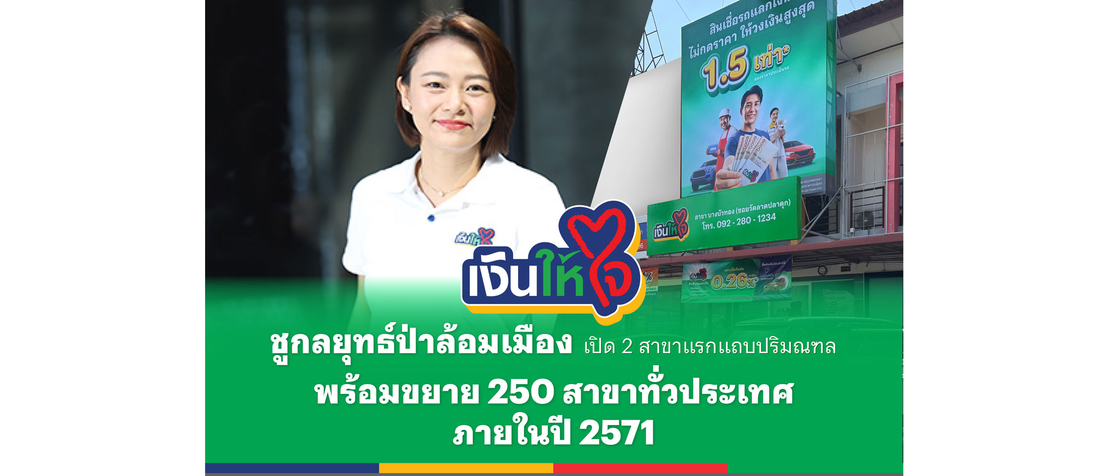 “เงินให้ใจ” ผู้ให้บริการสินเชื่อรถแลกเงิน ซึ่งเป็นบริษัทในกลุ่มธุรกิจทางการเงินของธนาคารกสิกรไทย ประกาศแผนกลยุทธ์ธุรกิจปี 2569 เปิดสาขาเงินให้ใจรูปแบบสแตนด์อโลนเป็นครั้งแรก นำร่อง 2 สาขาหลักไตรมาสแรกปี 2569 “บางบัวทองและลาดกระบัง” และขยายเป็น 250 สาขาทั่วประเทศภายในปี 2571 ภายใต้แนวคิด “ป่าล้อมเมือง” มุ่งสร้างการเติบโตเชิงคุณภาพ ควบคู่การยกระดับประสบการณ์ลูกค้าและการเข้าถึงผู้ประกอบการรายย่อยและลูกค้าในระดับชุมชน