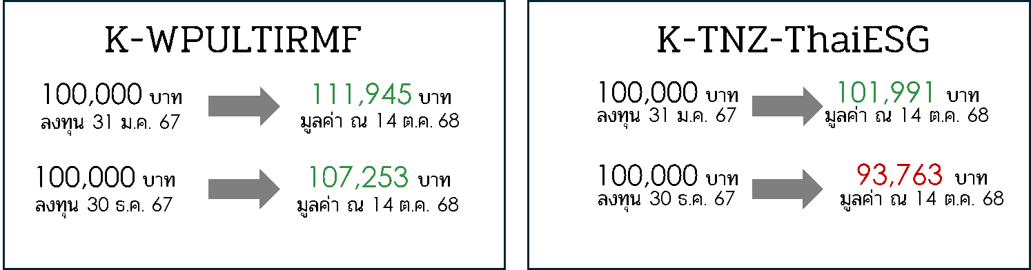 - กองทุน K-WPULTIRMF กองทุนรวมผสม ที่ลงทุนในตราสารหนี้บางส่วน โดยเน้นลงทุนในหุ้นหลากหลายทั่วโลก แบ่งเป็น 2 กรณี คือ เริ่มต้นลงทุนตั้งแต่ต้นปี (วันที่ 31 ม.ค. 67) กับลงทุนปลายปี (วันที่ 30 ธ.ค. 67) การลงทุนช่วงต้นปี 67 ผ่านมาจนถึงปัจจุบัน (14 ต.ค. 68) เงินโตขึ้นเป็น 111,945 บาท ซึ่งโตมากกว่าการลงทุนช่วงปลายปี 67 ที่ปัจจุบันเงินมีมูลค่าเพียง 107,253 บาท