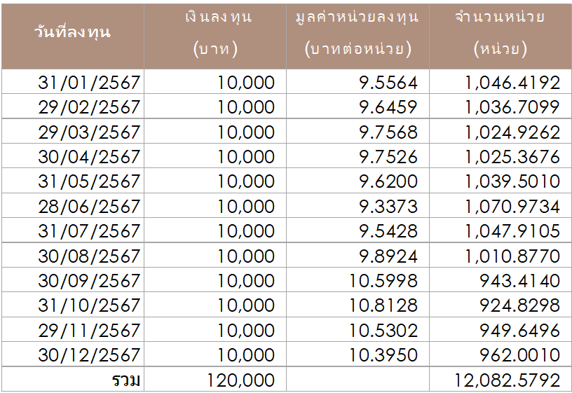 - รวมการลงทุนทั้งหมด 12 ครั้ง จะได้รับหน่วยลงทุนจำนวน 12,082.58 หน่วย มูลค่าเงินลงทุน ณ สิ้น ธ.ค. 67 อยู่ที่ 125,598.41 บาท (= 12,082.5792 หน่วย x 10.3950 บาทต่อหน่วย) สูงกว่าเงินลงทุนทั้งหมดที่ลงทุนไปหรือการลงทุนเพียงครั้งเดียวตอนเดือน ธ.ค. 67 ในอัตรา 4.67% และคิดเป็นต้นทุนเฉลี่ย 9.9317 บาทต่อหน่วย (= 120,000 บาท ÷ 12,082.5792 หน่วย)