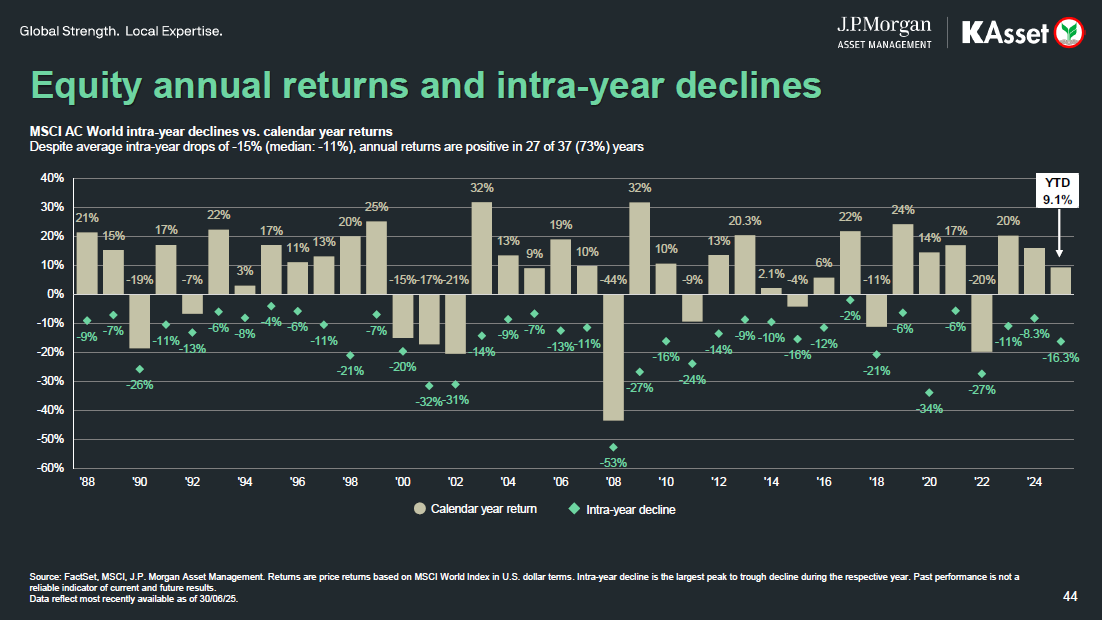 สถิติชวนหลอน: ข้อมูลจาก JPMAM ตามภาพด้านล่างบ่งชี้ว่า ตลาดหุ้นโดยปกติจะมีความผันผวน ทำให้ระหว่างปีผลตอบแทนมักติดลบ (สีเขียว) ถ้าเราโดนผีความผันผวนหลอก เราก็อาจจะขายหุ้นที่เราถือ หรือไม่กล้าลงทุนเพิ่ม แต่ถ้าดูกราฟแท่งที่เป็นผลตอบแทนเต็มปีจะเห็นว่า ส่วนมากมักเป็นบวก แปลว่าเราไม่ควรกลัวความผันผวน และมองการลงทุนเป็นเรื่องการสะสมความมั่งคั่ง “ระยะยาว” เพราะฉะนั้นถ้าเราเข้าใจ ซื้อสินทรัพย์ที่ดี แบบ DCA และถือยาวก็จะไม่ต้องเสียโอกาสในช่วงตลาดกระตุก