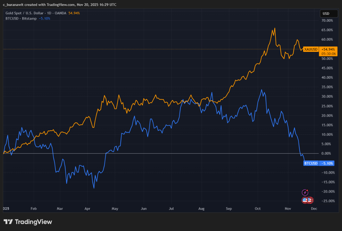 เมื่อสองสินทรัพย์คุณลักษณะเดียวกัน อยู่ในมือของกลุ่มคนที่แตกต่างกัน การตีมูลค่าในแต่ละช่วงเวลาจึงมีความแตกต่างกันอย่างสิ้นเชิง ในขณะที่ทองคำราคาปรับสูงขึ้นอย่างต่อเนื่อง ราคาของ Bitcoin กลับเคลื่อนไหวด้วยความผันผวนที่สูงกว่า และมีแนวโน้มซ้ำรอยการปรับฐานแรงตามรอบ 4 ปี