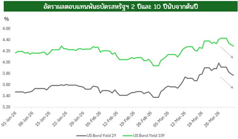 อย่างไรก็ตาม ในช่วงปลายเดือนมี.ค. Bond Yield เริ่มชะลอความร้อนแรงลง หลังเริ่มมีความหวังจากสัญญาณเชิงบวกว่าสงครามระหว่างสหรัฐฯ-อิหร่านใกล้จะคลี่คลาย ประกอบกับถ้อยแถลงของ Fed ว่าเงินเฟ้อยังคงอยู่ในกรอบที่ควบคุมได้ แม้ว่าราคาพลังงานจะปรับสูงขึ้น และยังไม่จำเป็นต้องขึ้นดอกเบี้ยเพิ่มเติม ส่งผลให้ Bond Yield ทั้งสหรัฐฯ และไทยชะลอลงในช่วงปลายเดือนมี.ค.