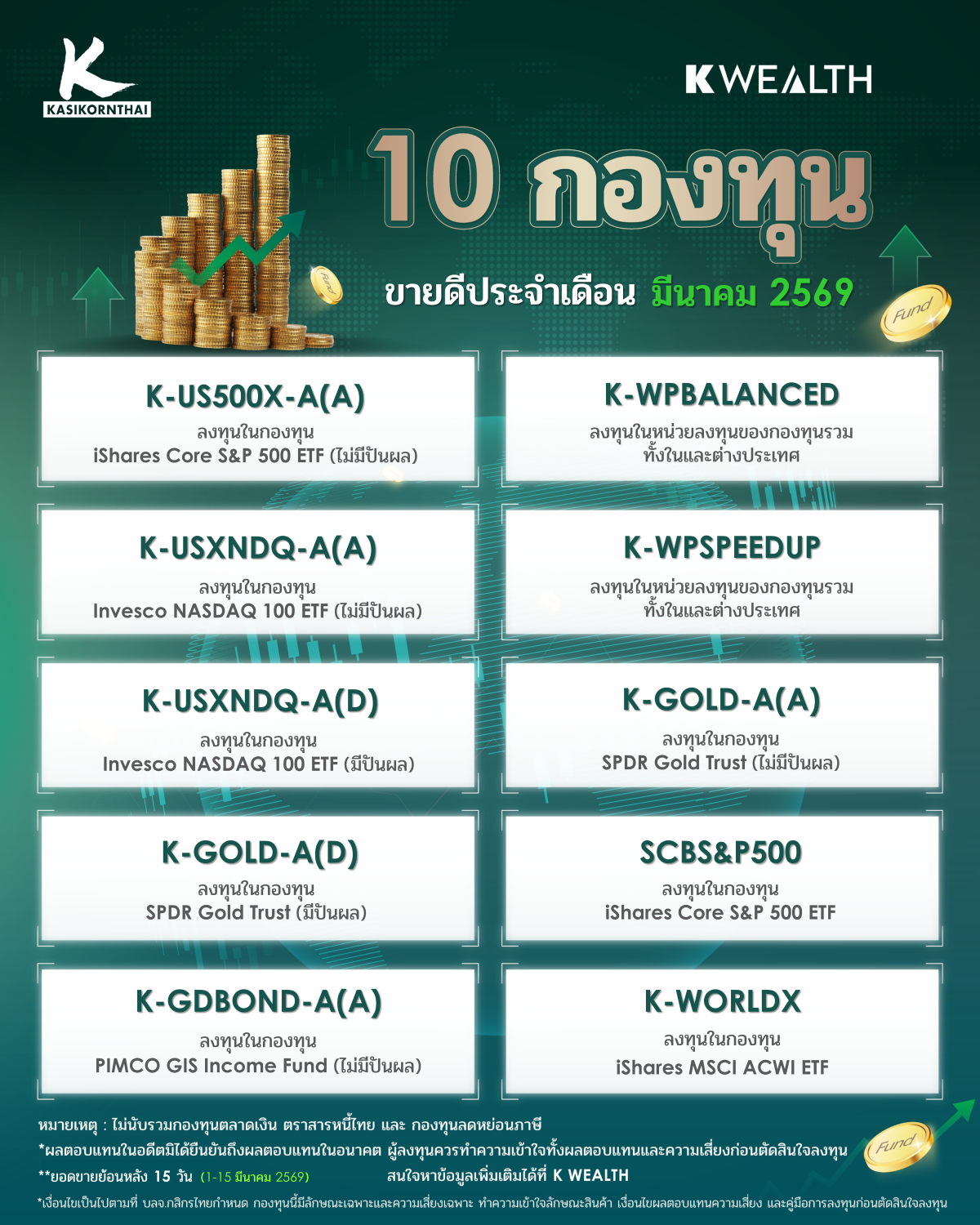 • กองทุนสินทรัพย์เสี่ยงยอดฮิต ในเดือน มี.ค. 69 ได้แก่ กองทุนหุ้นดัชนีสหรัฐฯ อย่าง K-US500X-A(A), K-USXNQ-A(A), K-USXNQ-A(D) และ SCBS&P500 กองทุนผสมอย่าง K-WPBALANCED และ K-WPSPEEDUP และกองทุนทองคำอย่าง K-GOLD-A(A), K-GOLD-A(D) และกองทุนหุ้นโลกอย่าง K-WORLDX สำหรับกองทุนตราสารหนี้ยอดฮิต มีติดอันดับกองทุนเดียว คือ กองทุนตราสารหนี้ต่างประเทศอย่าง K-GDBOND