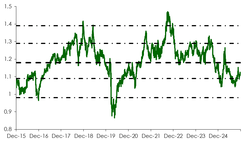 ตัดภาพมาที่ฝั่งตลาดหุ้นกันบ้าง เมื่อดูระดับมูลค่าจาก Forward P/E ก็ลดความตึงตัวลงมาที่ระดับประมาณ +1 SD และต่ำกว่าระดับสูงสุดที่ 2 SD ซึ่งเคยไปแตะเมื่อกลางปี 2024 สะท้อนว่าตลาดหุ้นอินเดียมียังมี Upside เหลือสำหรับปัจจัยบวกที่จะเข้ามา