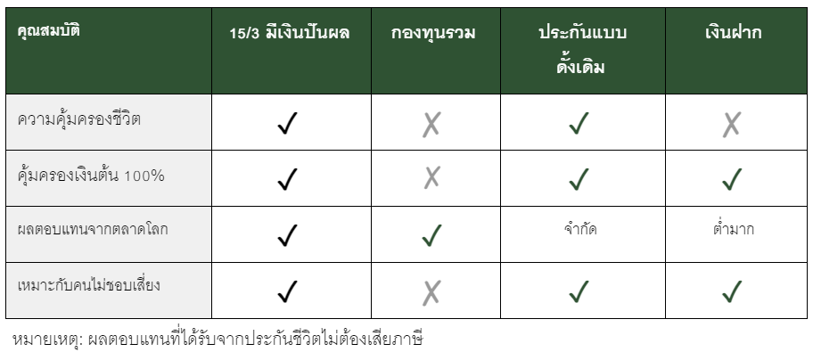 เมื่อเปรียบเทียบกับทางเลือกอื่นๆ ในตลาด จะเห็นว่า ประกันชีวิตสะสมทรัพย์ 15/3 มีเงินปันผล (S&P Multi-Asset ESG) มีจุดเด่นที่ชัดเจน