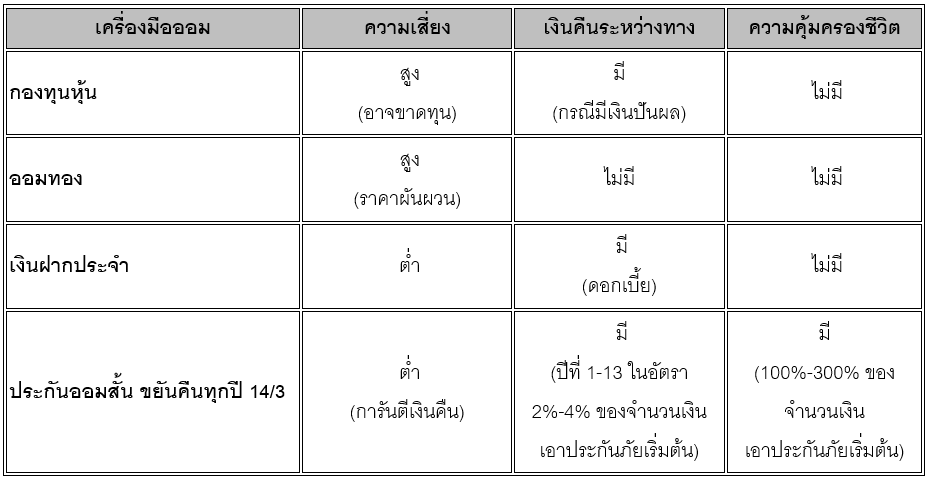 ก่อนที่จะไปดูว่าประกันออมสั้น ขยันคืนทุกปี 14/3 มีข้อดีอย่างไร เรามาทำความเข้าใจกับเครื่องมือออมเงินยอดนิยมในตลาดกันก่อนว่าเครื่องมือแต่ละประเภทมีข้อดีข้อเสียอย่างไร และเหมาะกับใครบ้าง