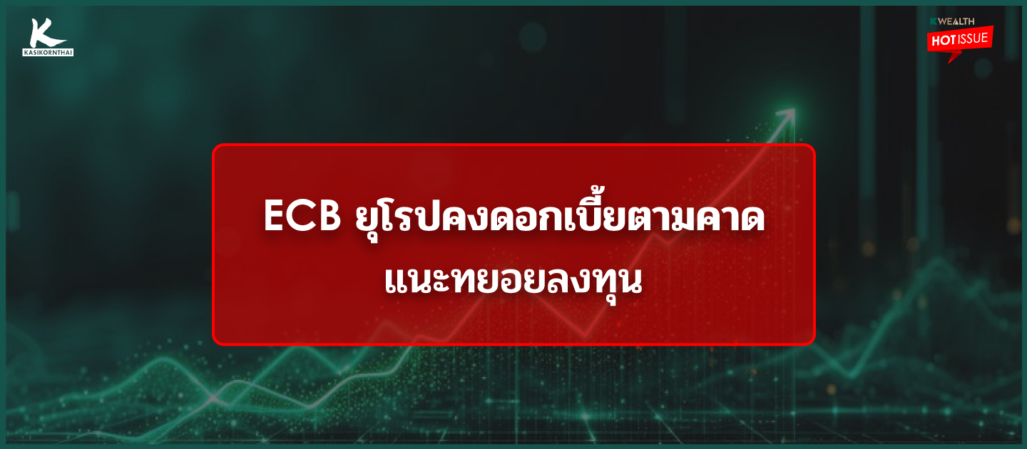 K WEALTH มีมุมมองค่อนข้างบวก (Slightly Positive) ต่อการลงทุนหุ้นยุโรป โดยตลาดมองว่ามีโอกาสที่ ECB จะลดดอกเบี้ยได้ในช่วงครึ่งปีหลัง แต่ก็ยังคงมีแนวโน้มที่อาจจะเปลี่ยนแปลงได้ โดยต้องรอดูผลของปัจจัยเสี่ยงทั้งภายในและภายนอกก่อน ดังนั้น