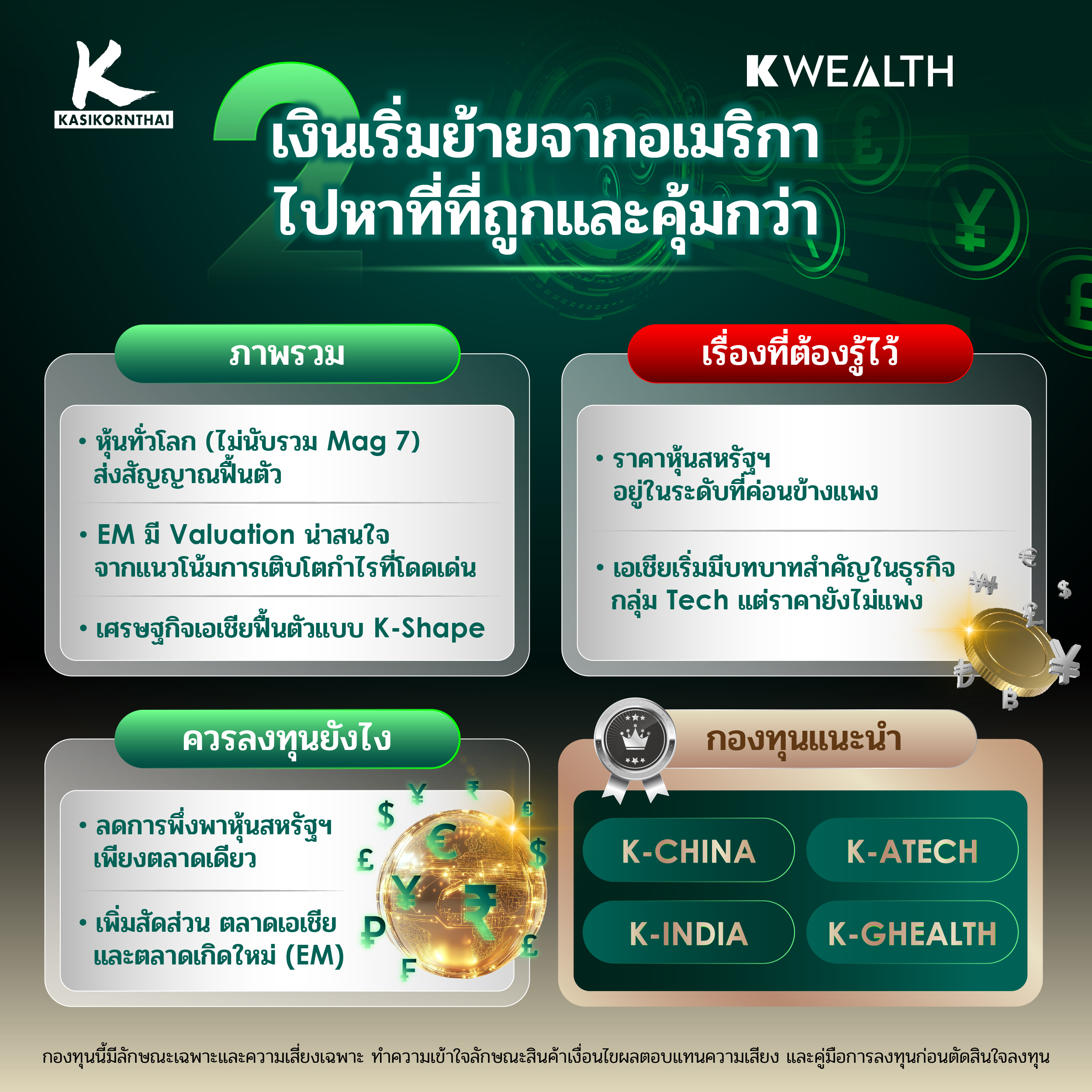 แนะนำให้เลือกลงทุนในหุ้นเอเชีย หรือกลุ่มเทคฯ เอเชีย, หุ้น US ที่ไม่ใช่Mag 7 เช่น กลุ่ม Healthcare หรือแม้แต่หุ้นยุโรปก็ถือว่าน่าสนใจ