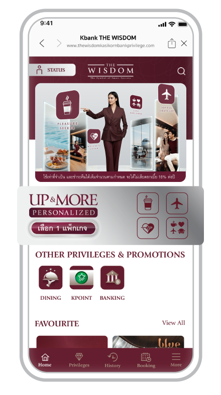 UP & MORE Personalized Package Privileges คือสิทธิพิเศษเฉพาะบุคคล ที่หลากหลายและพิเศษมากขึ้น สำหรับลูกค้า ที่มียอดเงินฝาก / เงินลงทุน กับธนาคารเฉลี่ย 6 เดือน ตั้งแต่ 10 ล้านบาท, 30 ล้านบาท, 50 ล้านบาท และ 150 ล้านบาทขึ้นไป และ/หรือจ่ายเบี้ยประกันชีวิตตามวิธีการคำนวณที่ธนาคารกำหนดโดยลูกค้าสามารถเลือกตรงกับ ความต้องการและตอบโจทย์ตามไลฟ์สไตล์ความชื่นชอบที่แตกต่างกันใน โดยเลือกรับ 1 แพ็กเกจ จากทั้งหมด 4 แพ็กเกจ ดังนี้