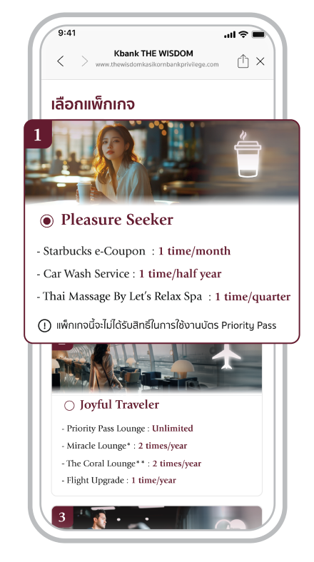 สำหรับท่านใหม่ ที่เพิ่งได้รับบัตรตั้งแต่วันที่ 1 ม.ค. 69 เป็นต้นไป สามารถเลือกแพ็กเกจได้ภายใน 30 วันนับจากวันที่ได้รับอนุมัติบัตร ได้ที่เมนู THE WISDOM Privilege บน LINE KBank Live หากผู้ถือบัตรไม่ได้เลือกภายในระยะเวลาที่กำหนดถือว่าผู้ถือบัตรตกลงเลือกแพ็กเกจ LIFE EXPLORER